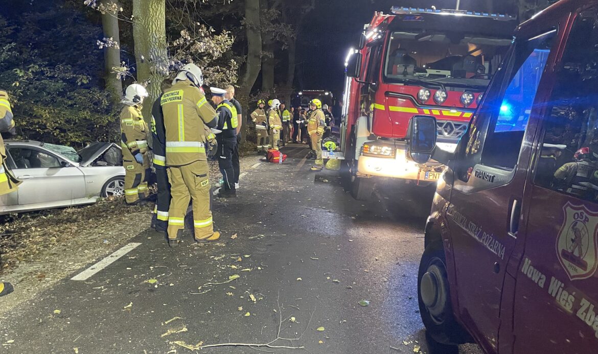 Do zdarzenia doszło w nocy z soboty na niedzielę, około godziny 1:45, na drodze Perzyny – Nowa Wieś Zbąska. Jak informują strażacy z OSP Nowa Wieś Zbąska, po przybyciu na miejsce służby zastały samochód osobowy poza jezdnią. Pojazd miał poważnie uszkodzony przód po uderzeniu w drzewo.