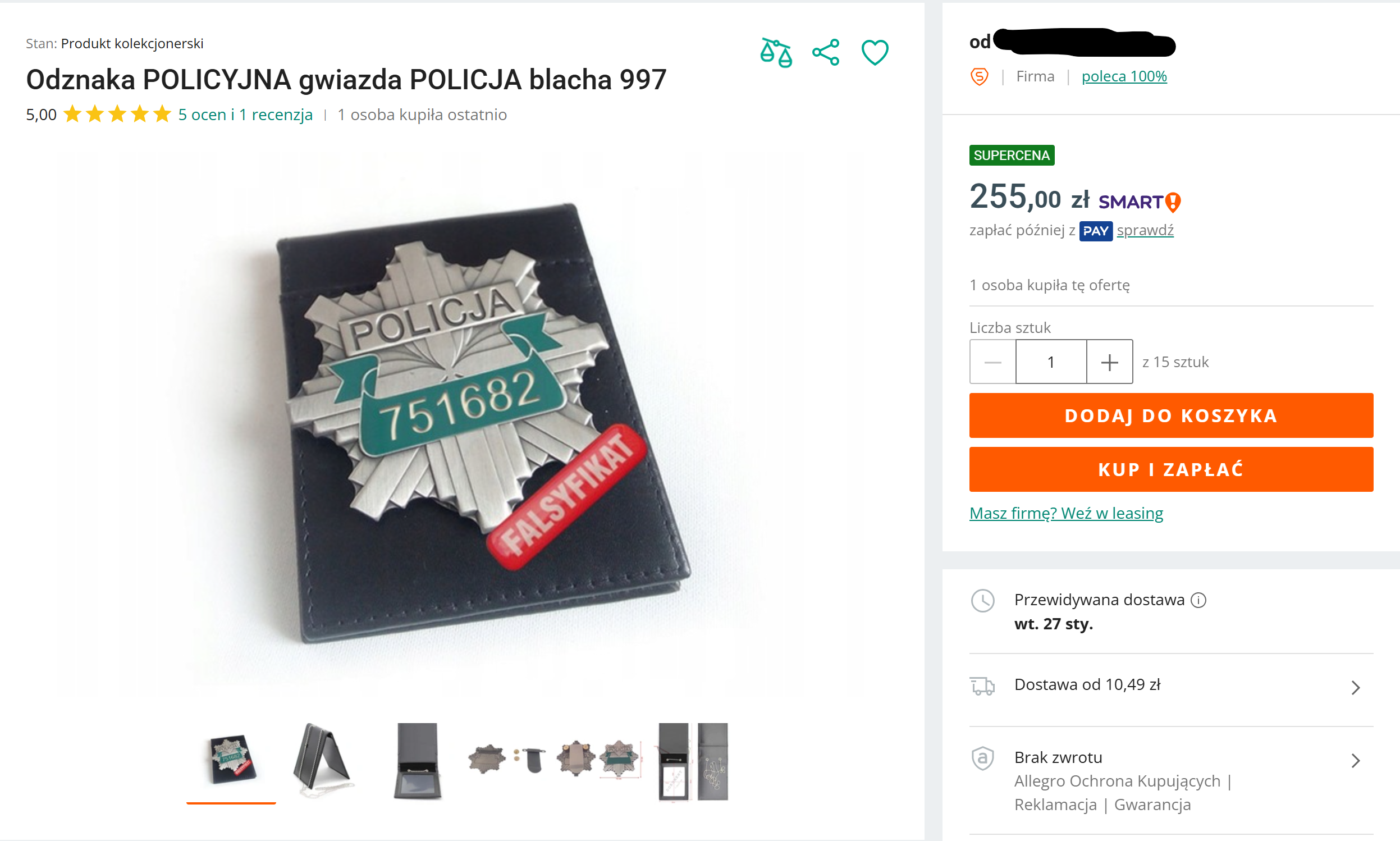 Skąd u cywila policyjna odznaka? Okazuje się, że podobną odznakę można z łatwością kupić w internecie. Na jednym z popularnych portali zakupowych falsyfikat odznaki kupić można już za nieco ponad 250 złotych.