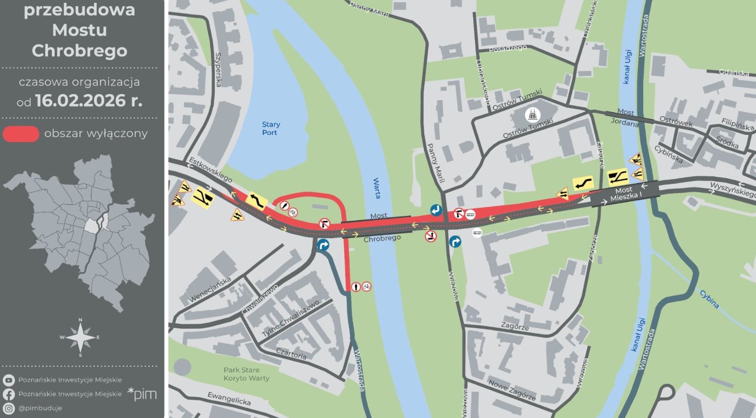 Przejazd poprowadzono przez tymczasowe przewiązki przy Moście Mieszka I i w rejonie ulicy Szyperskiej. Chodnik na południowej części mostu pozostanie otwarty dla pieszych.