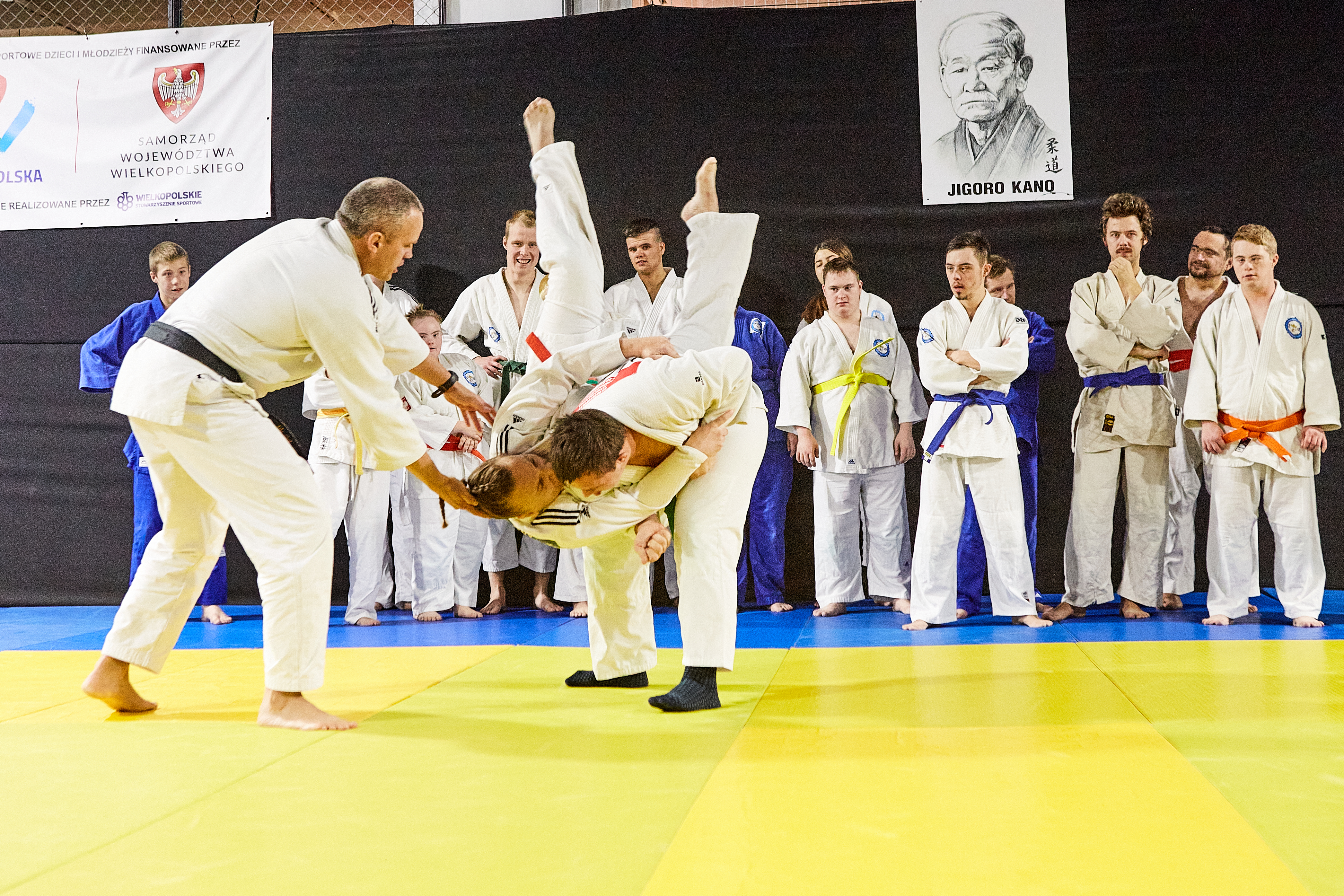 Hala sportów walki na Międzynarodowych Targach Poznańskich. To tam trenuje Akademia Judo dopóki nie zostanie oddane do użytku nowe miejsce przy ul. Jarochowskiego. Sala jest podzielona na trzy części. W jednej trenują przedszkolaki, w drugiej młodzież. Trzecią zajmuje wyjątkowa sekcja. Sekcja osób z niepełnosprawnościami.