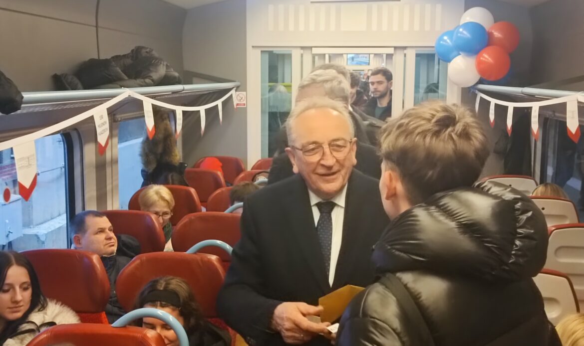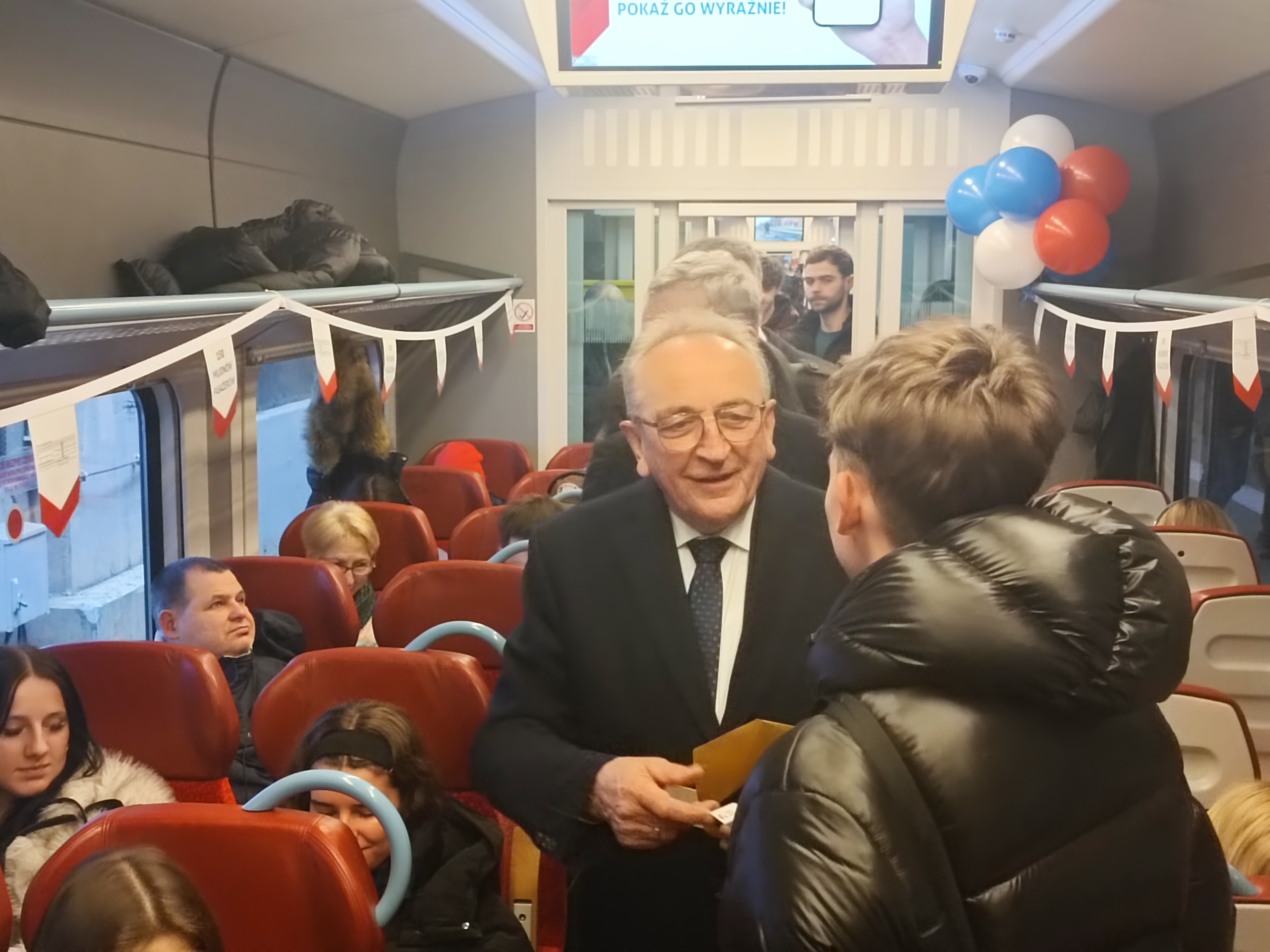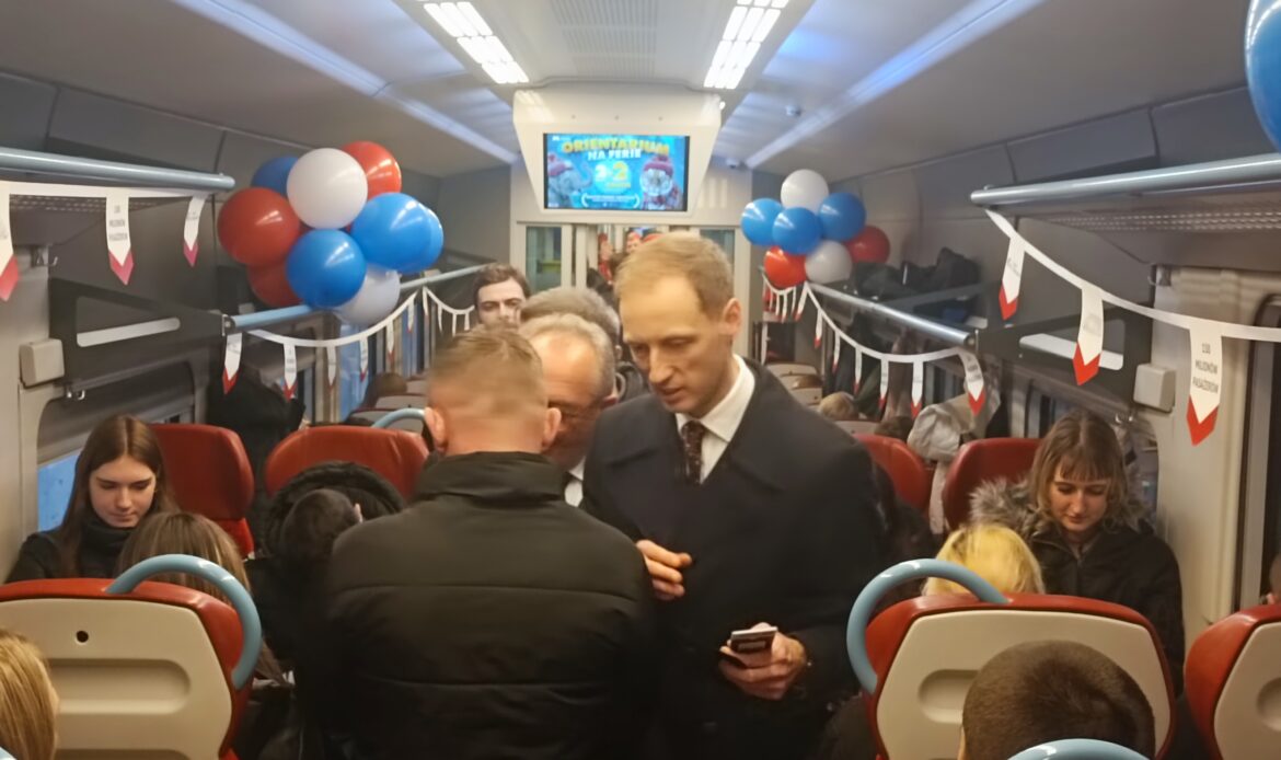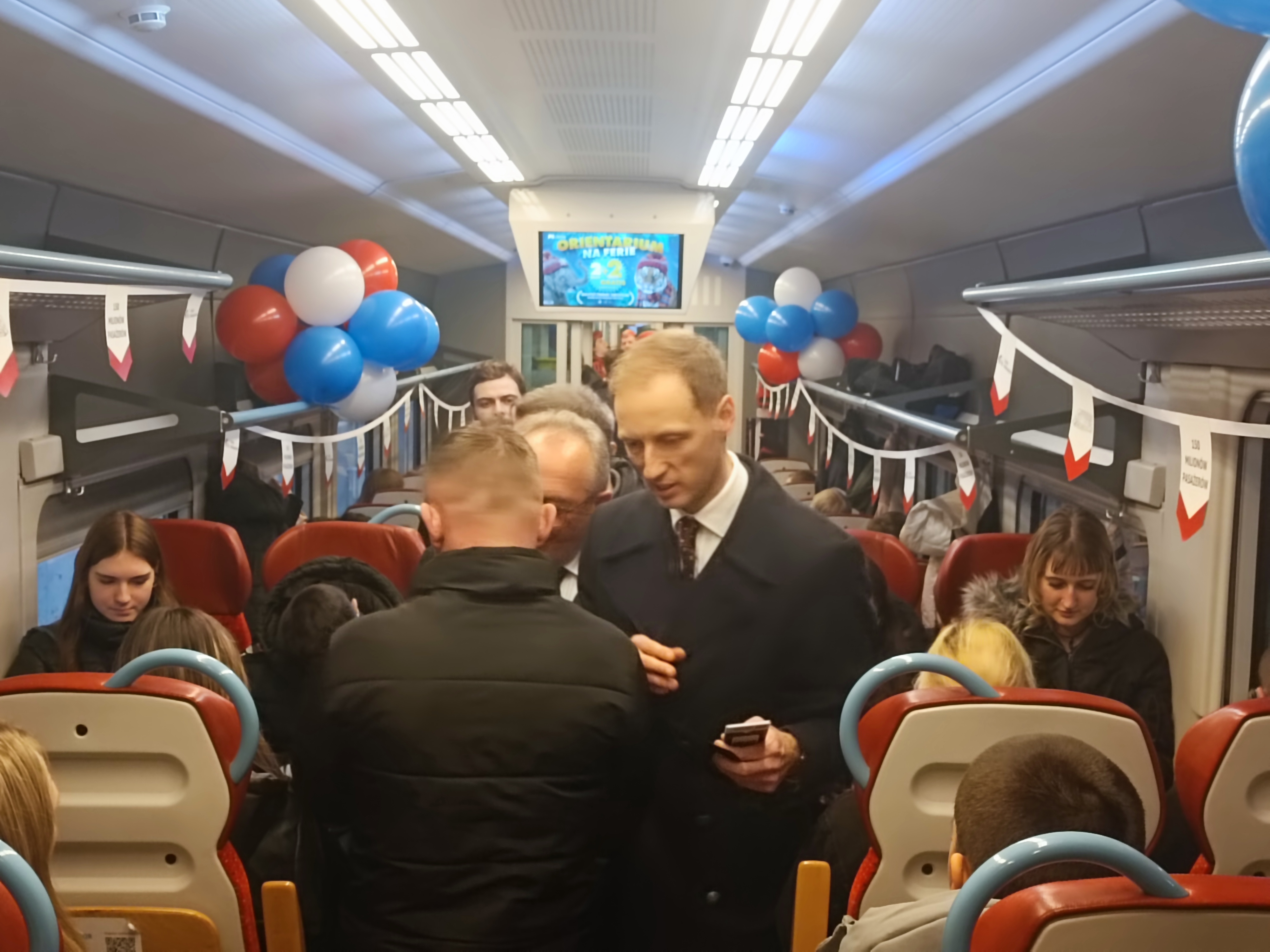 W jubileuszowym przejeździe wzięli też udział przedstawiciele województwa i Kolei Wielkopolskich. Przeszli przez cały pociąg, gratulując i rozdając bony zniżkowe na przejazdy wszystkim pasażerom. Nie zabrakło także słodkiego upominku jak przystało na tłusty czwartek.