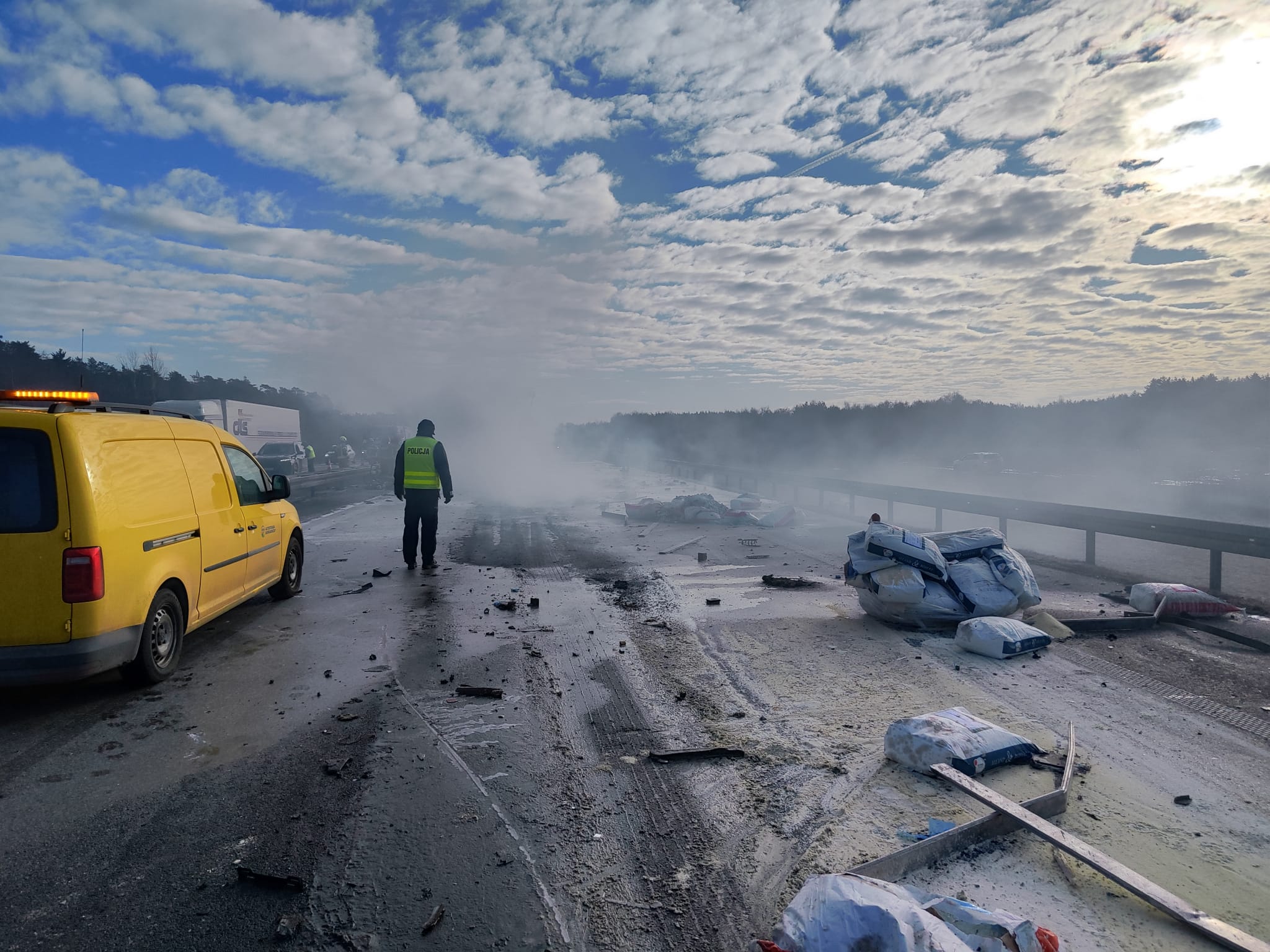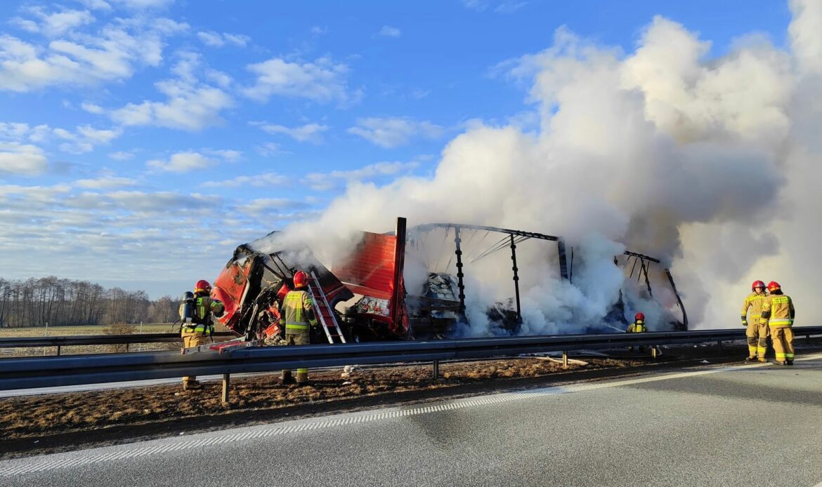 Na autostradzie A2 w rejonie m. Kowalewek (za węzłem Sługocin, pow. słupecki) doszło do zderzenia dwóch ciężarówek. Jedno auto się pali. Droga jest zablokowana.