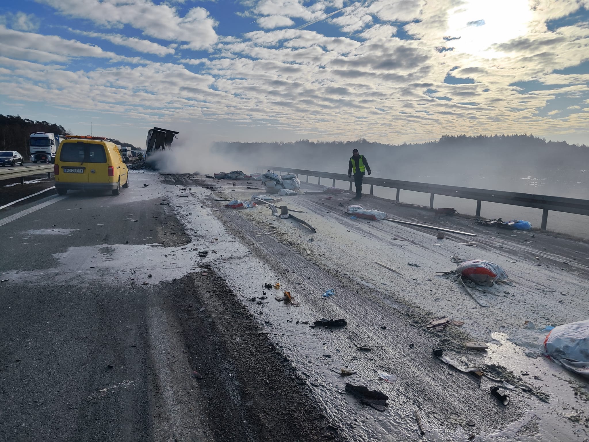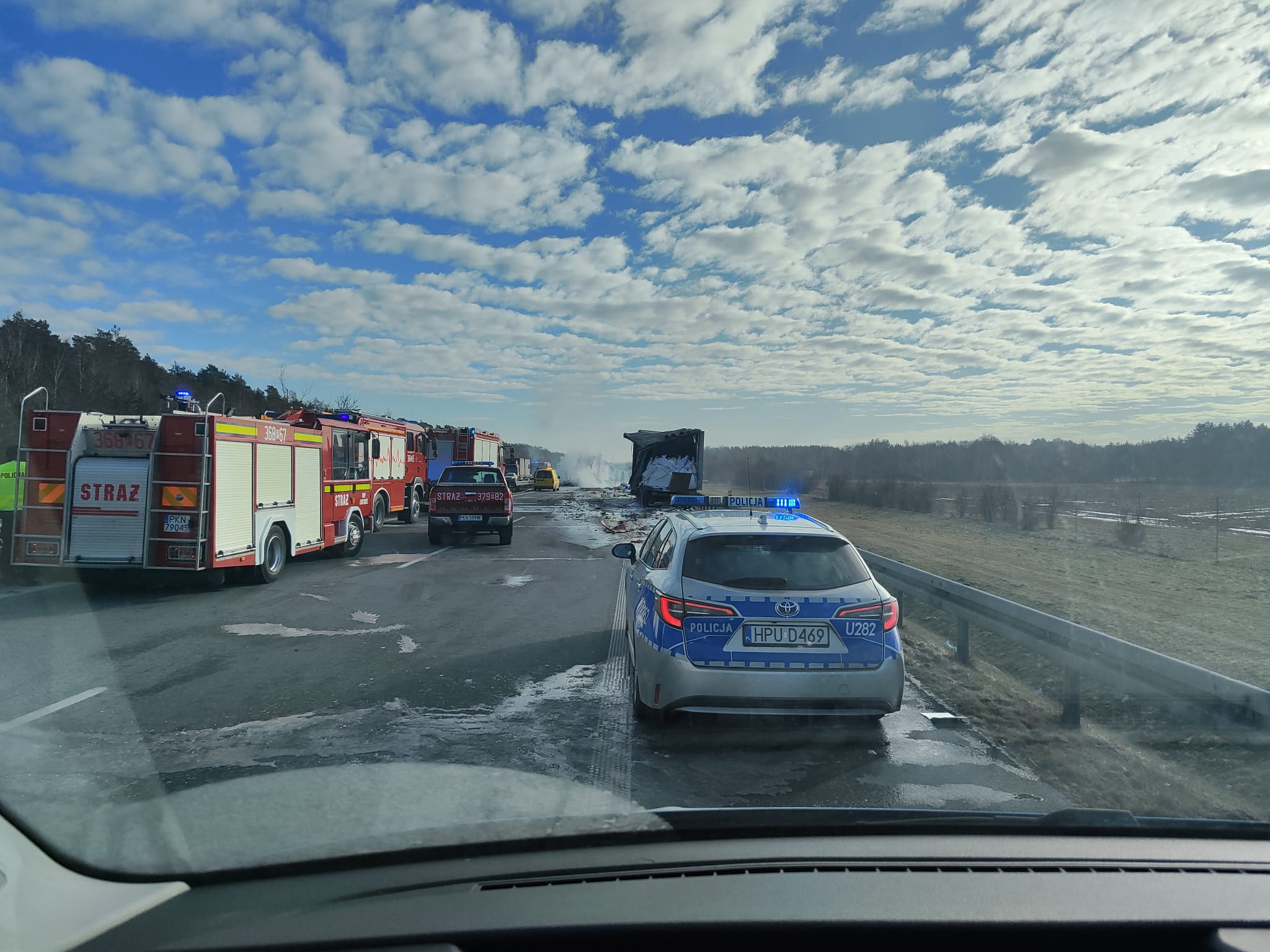Ruch pojazdów w kierunku Warszawy jest całkowicie wstrzymany. Dla pojazdów wyznaczono objazdy DK92. Decyzją PSP na czas prowadzenia akcji gaśniczej zablokowano rownież ruch pojazdów w kierunku Poznania. Utrudnienia mogą potrwać do godz. 11:00. Na miejscu pracują służby. Auta, które utknęły w korku, będą z niego wycofywane.